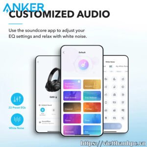Tải xuống ứng dụng soundcore để điều chỉnh âm thanh của bạn bằng cách sử dụng EQ có thể tùy chỉnh, với 22 cài đặt trước hoặc tự điều chỉnh. Bạn cũng có thể chuyển đổi giữa 3 chế độ: ANC, Bình thường và Trong suốt và thư giãn với tiếng ồn trắng.