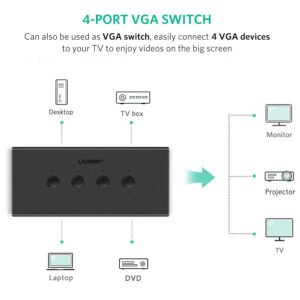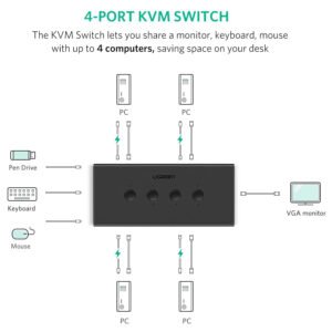 - Bộ chuyển KVM 4 máy tính vào 1 màn hình chuẩn VGA Ugreen 50280 sử dụng để điều khiển 4 máy tính hiển thị vào một màn hình (chuột và bàn phím điều khiển máy tính). Sản phẩm là giải pháp tuyệt vời cho hệ thống máy trạm hoặc bất cứ nơi nào sử dụng đa nhiệm giữa các máy tính.