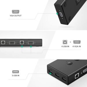 - Bộ KVM 4 vào 1 bao gồm 3 cổng USB A (để sử dụng bàn phím, chuột), 4 đầu ra USB B (sử dụng để cấp nguồn vào máy tính), 4 đầu vào VGA kết nối cho 4 máy tính khác nhau có nút lựa chọn hiển thị thiết bị, và 1 đầu ra VGA dành cho màn hình.