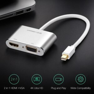 Cáp chuyển đổi tín hiệu Mini Displayport sang HDMI và VGA Ugreen 20321 là phụ kiện chính hãng Ugreen cao cấp được thiết kế để kết nối máy tính, laptop có cổng Thunderbolt như Macbook Pro, Macbook Air, iMac, Laptop Thinkpad…etc với màn hình máy tính, máy chiếu, HDTV thông qua cổng HDMI hoặc VGA.