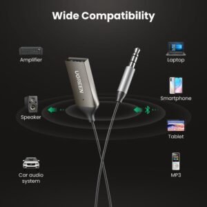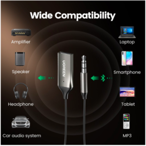 Bộ thu Bluetooth 5.0 tích hợp mic sử dụng trên ô tô, loa Ugreen 70601 được trang bị cổng âm thanh 3.5mm dùng để kết nối với hệ thống âm thanh trên xe hơi, loa. Cổng USB A phải kết nối để cấp nguồn. (Bạn có thể cấp nguồn qua cổng USB trên ô tô, máy tính xách tay hoặc bất kỳ nguồn điện USB nào khác).