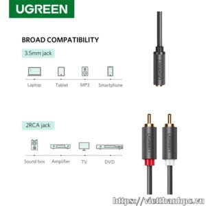 Cáp Audio 3.5mm âm ra 2 RCA dương dài 20cm UGREEN 10561 là thiết bị lý tưởng để kết nối tai nghe stereo 3.5mm, hầu hết các hệ thống âm thanh gia đình với một bộ khuếch đại hoặc nhận sử dụng jack cắm RCA cho âm thanh đầu vào.