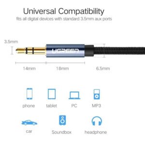 - Cáp Audio 3.5mm bẻ góc 90 độ dài 1,5m Ugreen 60180 kết nối truyền tải âm thanh giữa các thiết bị chuẩn âm thanh 3.5mm với nhau như điện thoại, laptop sang tai nghe, loa,…