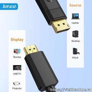 – Cáp DisplayPort ra HDMI hỗ trợ 4K@30Hz JASOZ A230 là sợi cáp cao cấp trên thị trường hiện nay, với chức năng giúp kết nối Laptop, PC, Card đồ họa… với màn hình Tivi, Máy Chiếu, Monitor… qua chuẩn chuyển đổi tín hiệu từ DisplayPort ra HDMI, hỗ trợ độ phân giải sắc nét UltraHD 4K@30Hz mang đến chất lượng hình ảnh và âm thanh vô cùng chân thật, sống động mà không bị delay hay giật lag.