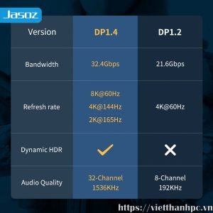 Cáp DisplayPort 1.4 chính hãng JASOZ A262 hỗ trợ tốc độ truyền lên tới 32,4Gbps Băng thông, độ phân giải lên tới 7680×4320, tốc độ làm mới lên tới 8K@60Hz, 4K@144Hz, 2k@165Hz.