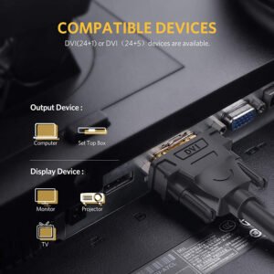 Cáp DVI 24+1 dài 2m Ugreen 11604 kết nối hình ảnh từ các thiết bị hỗ trợ cổng DVI 24+1 như máy tính, đầu đĩa DVD ra màn hình Tivi, máy chiếu.