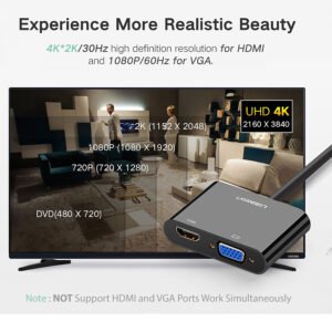 - Cáp chuyển đổi hỗ trợ độ phân giải cổng HDMI lên đến 4K*2K@30Hz và 1920×1200@60Hz cho ngõ ra cổng VGA. Mang đến cho bạn trải nghiệm âm thanh và hình ảnh hoàn toàn mới, Ugreen 40744 là giải pháp hoàn hảo cho mọi nhu cầu sử dụng.