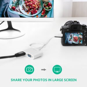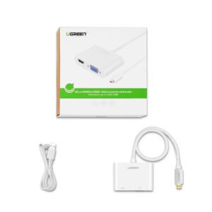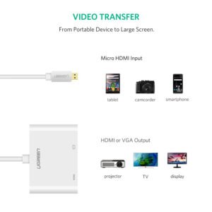 - Bộ chuyển đổi Micro HDMI sang HDMI + VGA Ugreen 30354 giải pháp kết nối máy tính, máy tính bảng, điện thoại thông minh, máy ảnh và máy quay video hoặc thiết bị khác hỗ trợ Micro-HDMI với màn hình hoặc máy chiếu lớn hoặc TV với cổng HDMI hoặc VGA để chia sẻ dữ liệu và video kỹ thuật số.