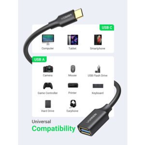 - Cáp chuyển USB Type C to USB 3.0 Ugreen 30701 được kết nối với các thiết bị ngoại vi chuẩn USB như chuột, bàn phím, USB Flash, máy in, đọc ổ cứng…với máy tính, điện thoại di động thông qua cổng USB Type C.