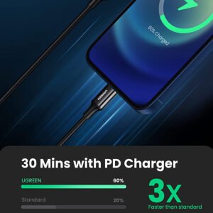 - Cáp USB Type C to Lightning dài 1m Ugreen 60751 giúp bạn có thể sạc thiết bị của mình nhanh gấp đôi so với cáp tiêu chuẩn đi kèm thiết bị của bạn. Cụ thể, bạn có thể sử dụng cáp này với các bộ sạc USB-C Power như PD18W, 30W, 45W, 61W, 65W hoặc 87W và thậm chí là Power Banks hỗ trợ PD để sạc thiết bị IOS.