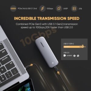 – Hộp đựng ổ cứng SSD Ugreen 60354 có vỏ Caddy SATA M.2 có giao diện SATA II và Type C 3.1 Gen2, hỗ trợ tốc độ truyền dữ liệu lên đến 10Gbps, đủ nhanh để truyền phim khổng lồ trong vài giây.