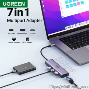 Bộ chia USB-C 7 trong 1 của Ugreen 60515 có cổng Ethernet 1000Mbps, cổng HDMI 4K@60Hz, cổng sạc USB C với phân phối điện 100W, đầu đọc thẻ SD/TF và 2 cổng USB 3.0. Kết nối với các thiết bị MacBook Pro hoặc USB-C mới nhất bằng bộ chuyển đổi đa cổng để mang lại sự tiện lợi cho công việc của bạn.